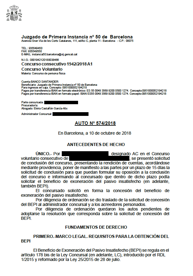 En este sentido, Auto de 15/11/18 del Juzgado de Primera Instancia no 3 de Badalona en el concurso 774/17, Auto de fecha 12/11/18 del Juzgado de Primera Instancia no 50 de Barcelona en el concurso consecutivo 4124/2018.